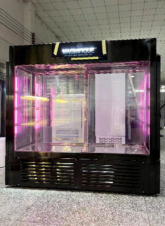 First, the visual appeal is paramount. Conventional dry aging cabinets have a single glass door. While this allows for convenient observation of the meat's condition, it also attracts customers, enhancing the restaurant's competitiveness. VOI Cuisine wished to have a fully transparent glass on all sides of the customized equipment for a prominent display near the entrance.