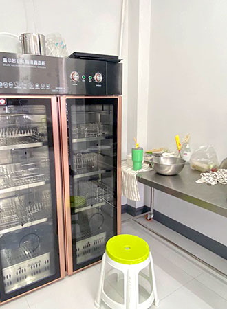 In the cleaning area, there is a hood-type dishwasher and a sink workstation, where dishes and tools are cleaned and then put into the sterilizer in the corner to ensure safety and hygiene. All equipment from Chefmax is made of high quality stainless steel, resistant to grease and water, and easy to clean.